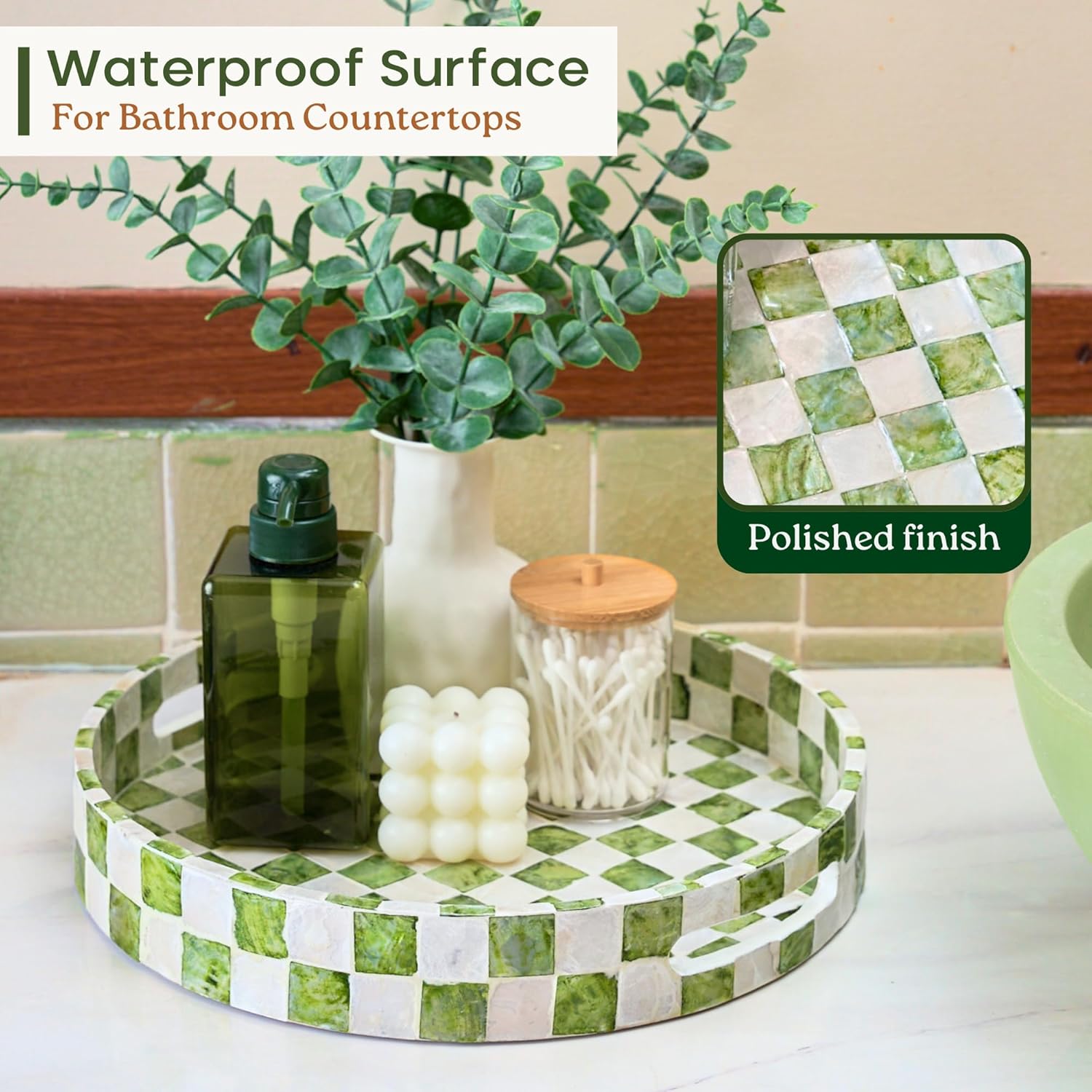 12.6″ Capiz Decorative Tray with Handles, Checkered Round Serving Tray for Coffee Table, Kitchen Counter, or Bathroom (Pistachio Green)