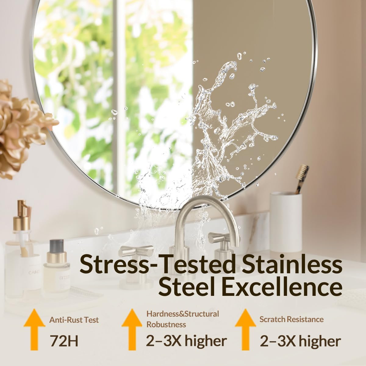 ANDY STAR Round Bathroom Mirror, 24’’ Brushed Silver Round Bathroom Mirrors in Stainless Steel Metal Frame 1″ Deep Set Design