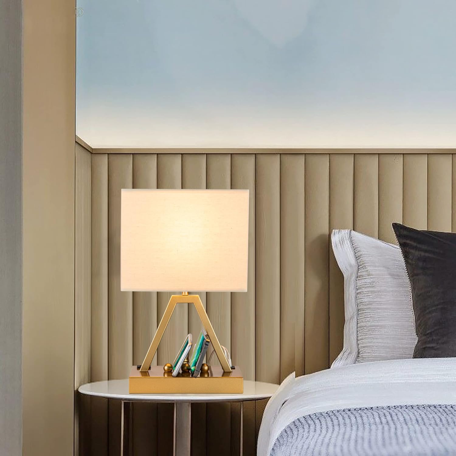 Briever Touch Control Table Lamp, 3-Way Dimmable Desk Lamp with USB C & USB A and AC Outlet, Bedside Lamp with Phone Stand and Fabric Shade for Bedroom, Living Room,Bulb Included, Gold
