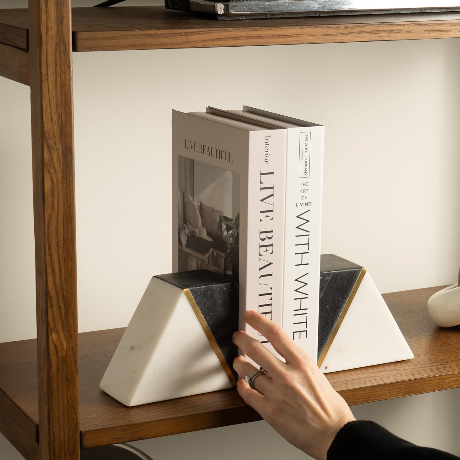 Cork & Mill Marble Book Ends for Shelves, Decorative Bookends for Heavy Books, Unique Mid Century Modern Gray and White Bookends with Brass Inlay, Heavy Duty Bookshelf Stopper, Set of 2