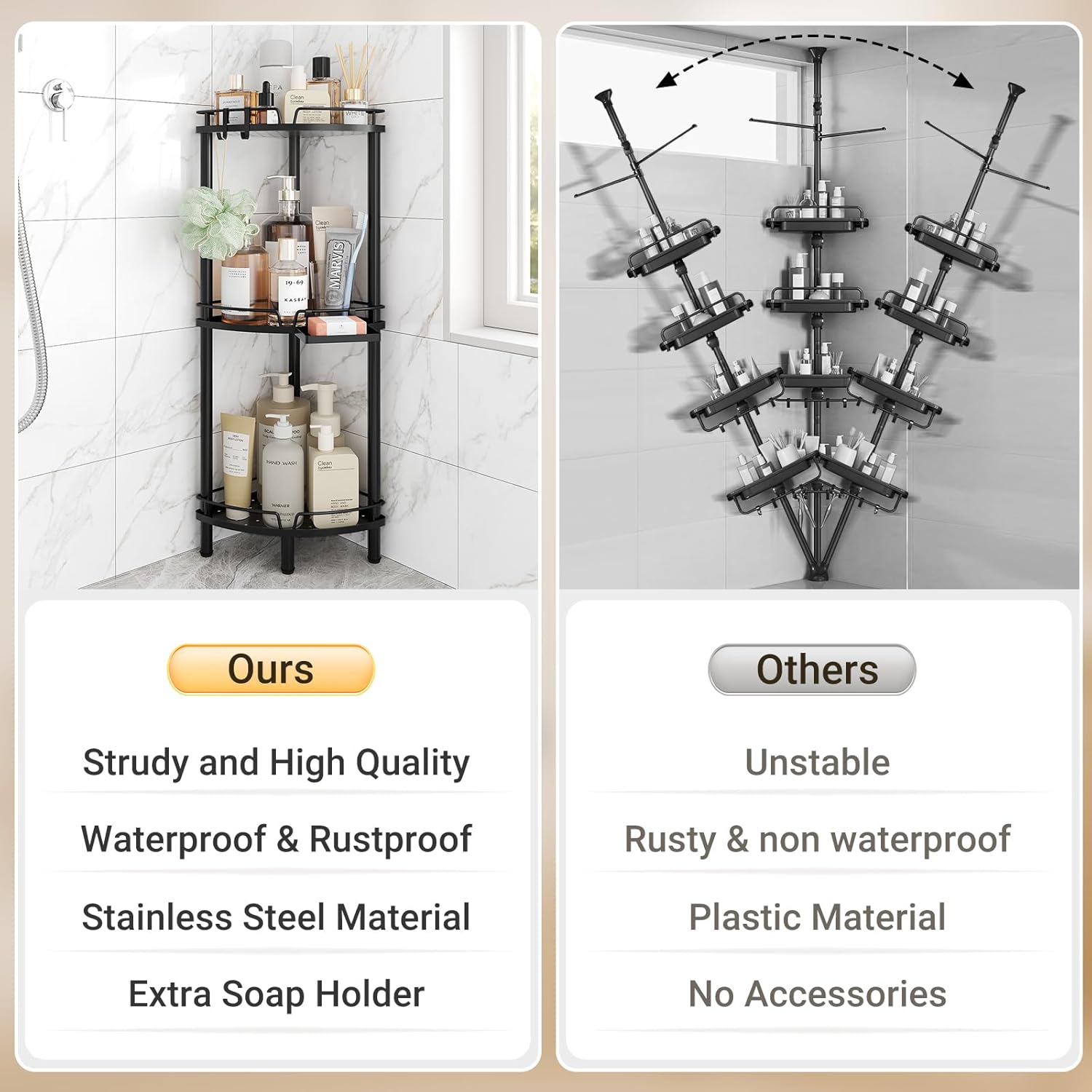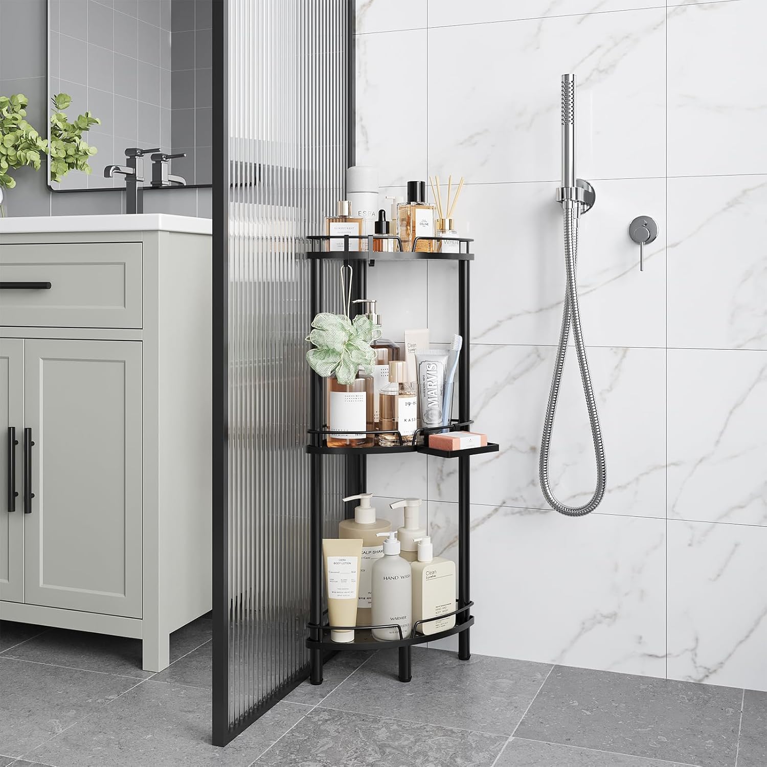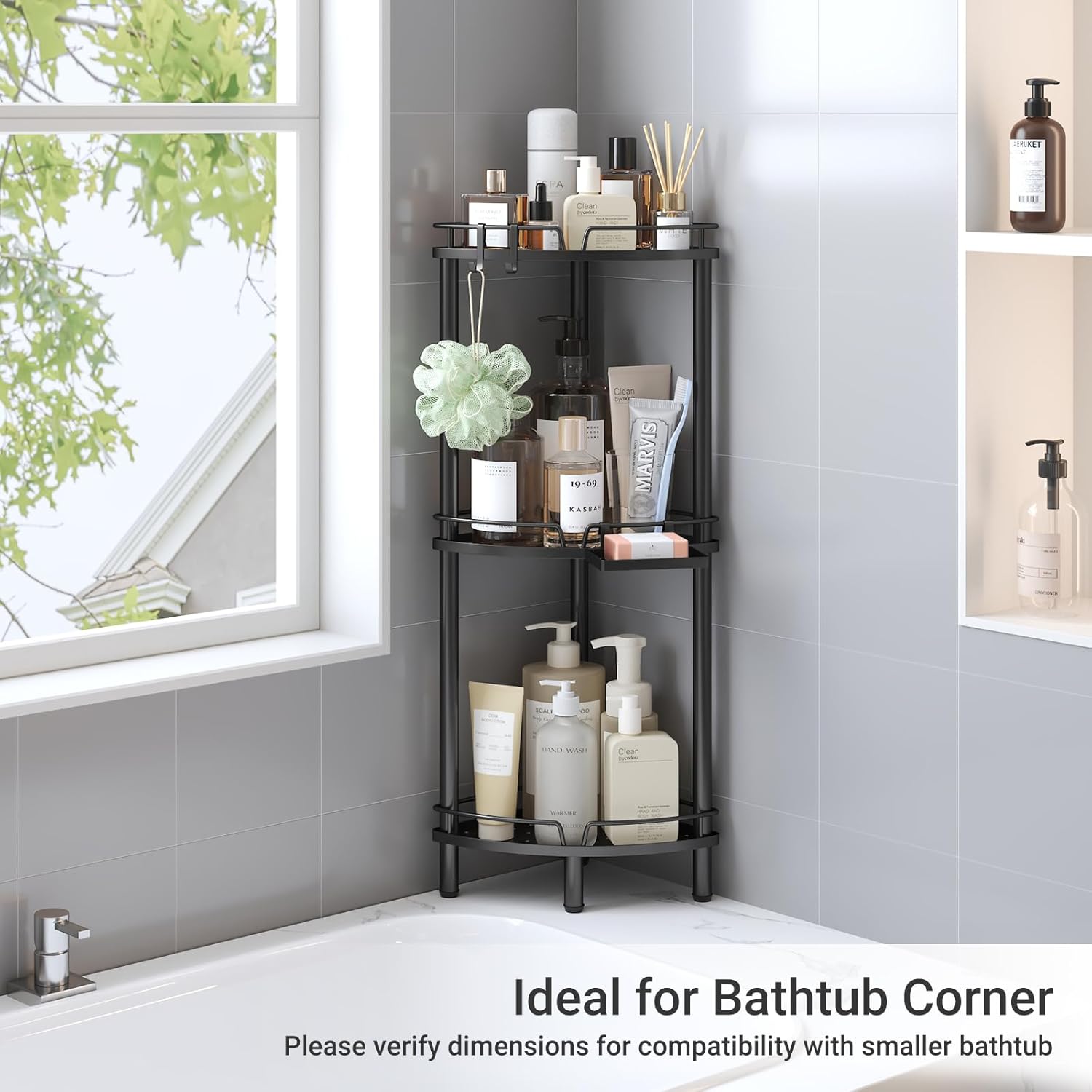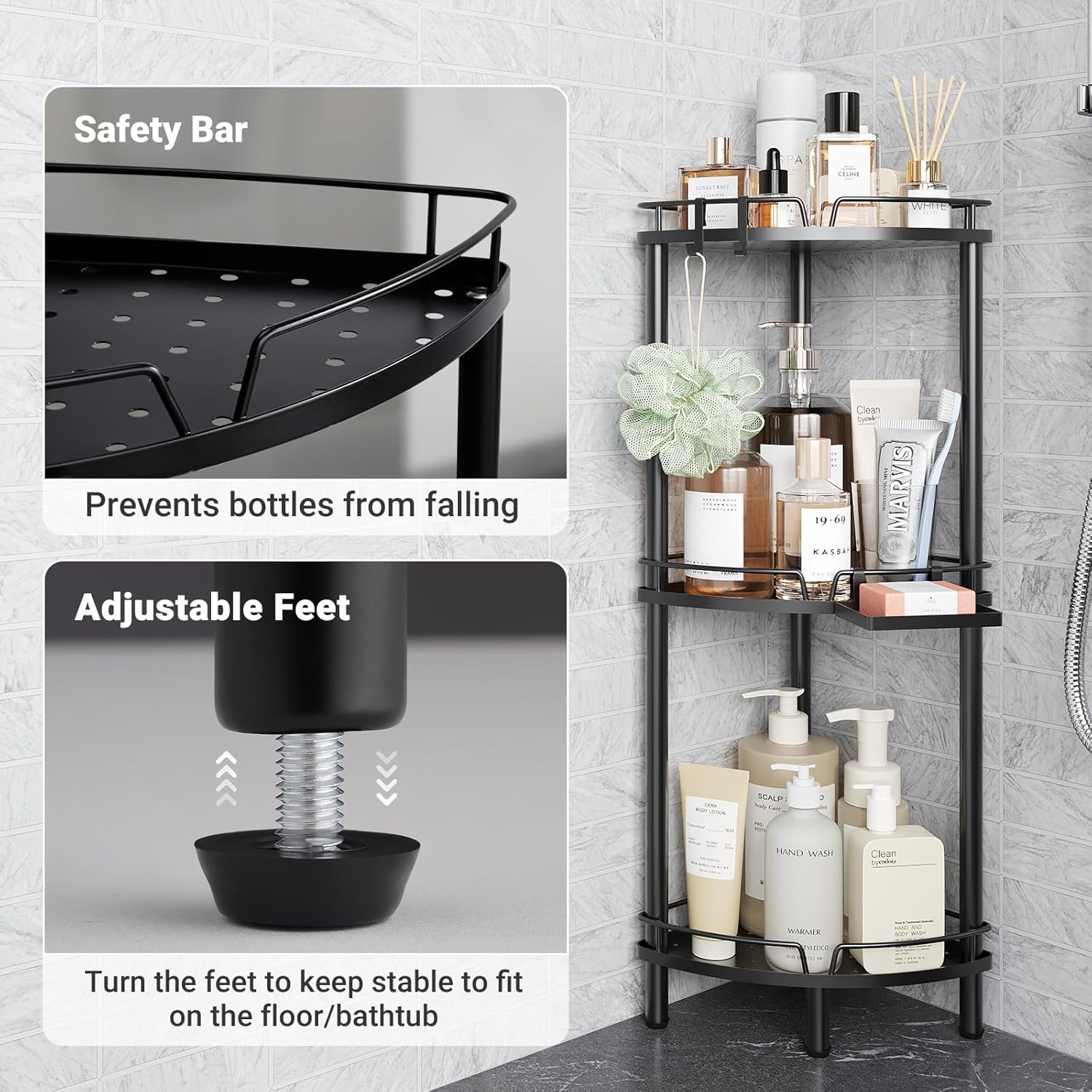 ELYKEN Corner Shower Caddy Standing, 3 Tier Rustproof Metal Shower Organizer with Soap Holder, Floor Shower Corner Shelf Rack Storage Stands with Adjustable Feet & 2 Hooks for Bathroom, Black