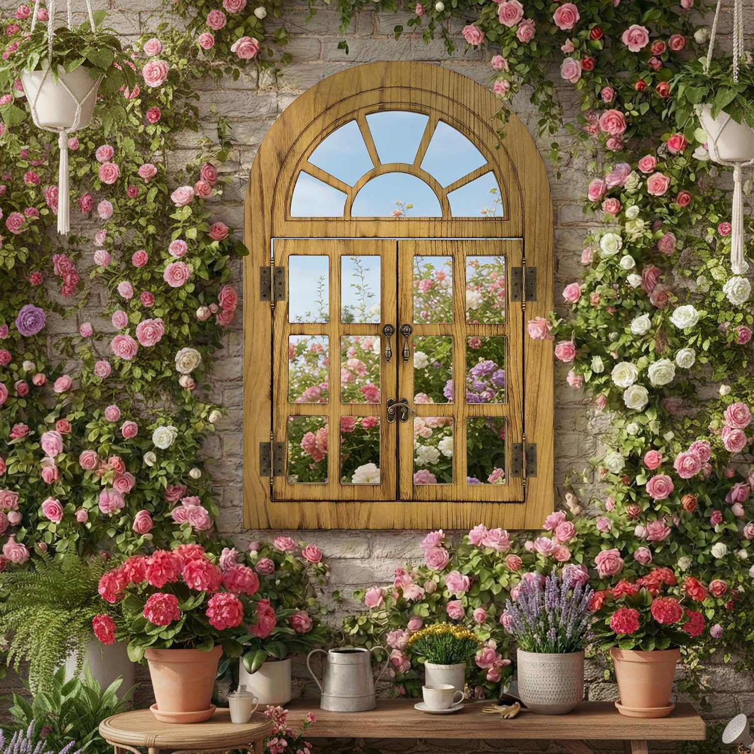 Farmhouse Arched Window Mirror for Wall Decor, Wood Open & Close Windowpane with Half-Round Top Design, Rustic Decorative Wall Mirror for Living Room, Entryway (20″ x 30″, Natural, 1 Pack)