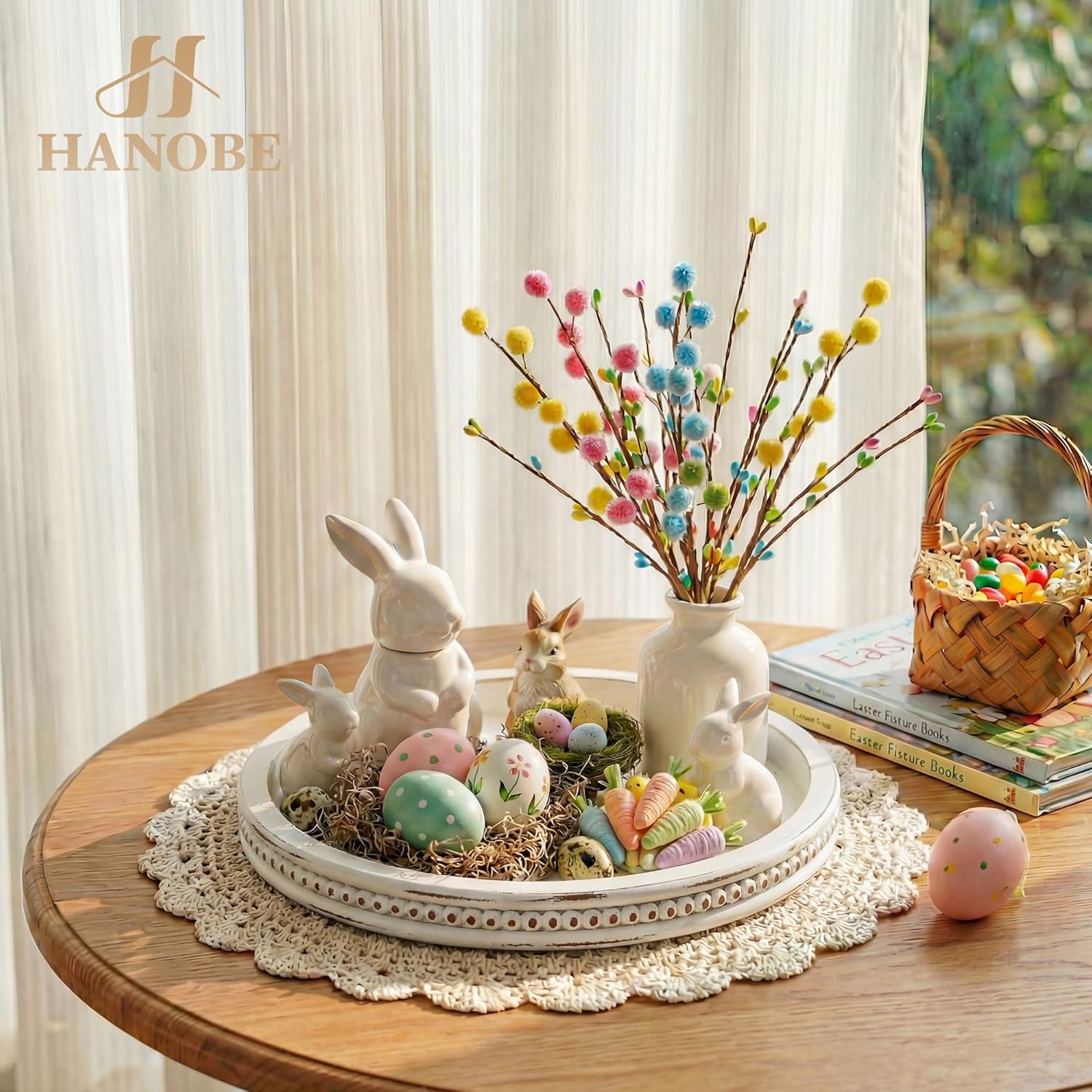 Hanobe Round Wooden Decorative Tray: White Washed Bead Tray Decor for Coffee Table Centerpiece Rustic Farmhouse Tray for Kitchen Counter Living Room Easter Decoration