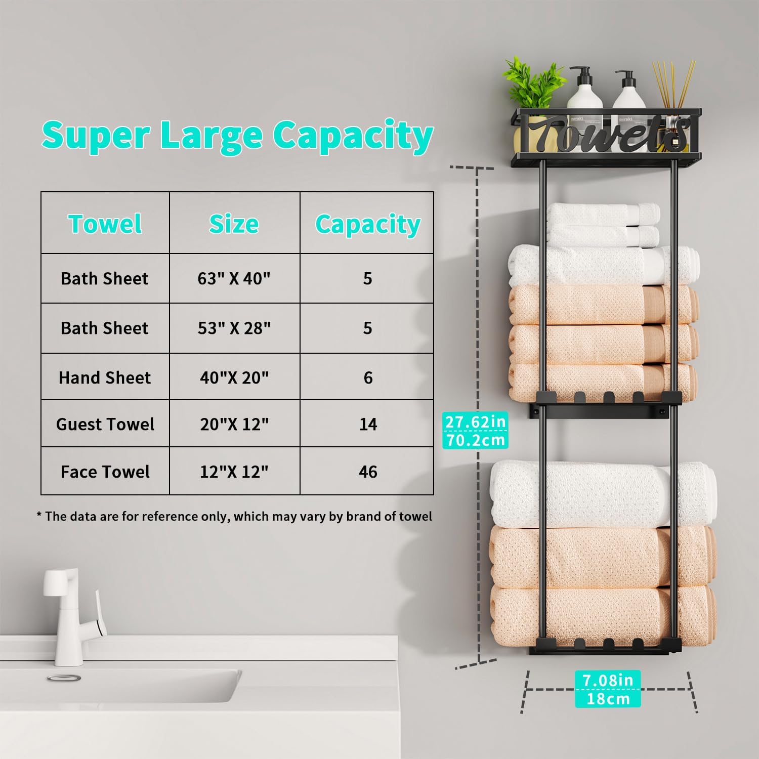 HapiRm Towel Rack Bathroom Storage – 3 Tier Over The Door & Wall Mounted Rolled Towel Racks Holder Organizer with Metal Shelf and 6 Hooks for Small Bathroom, Camper, Rv – Black (for 1.77 in Doors)