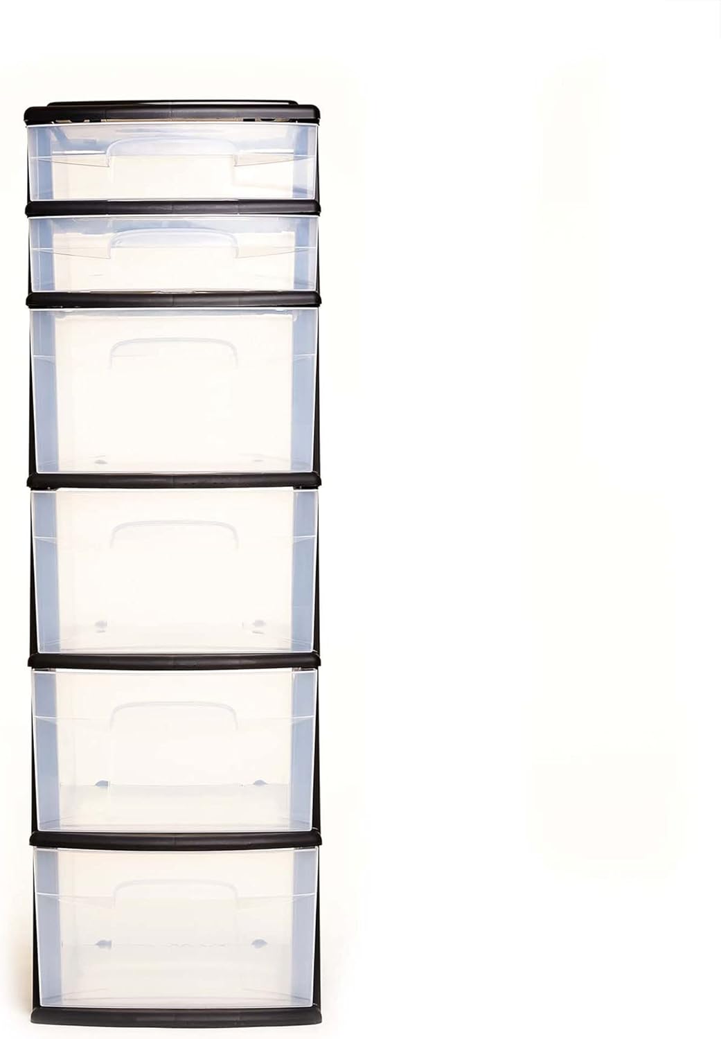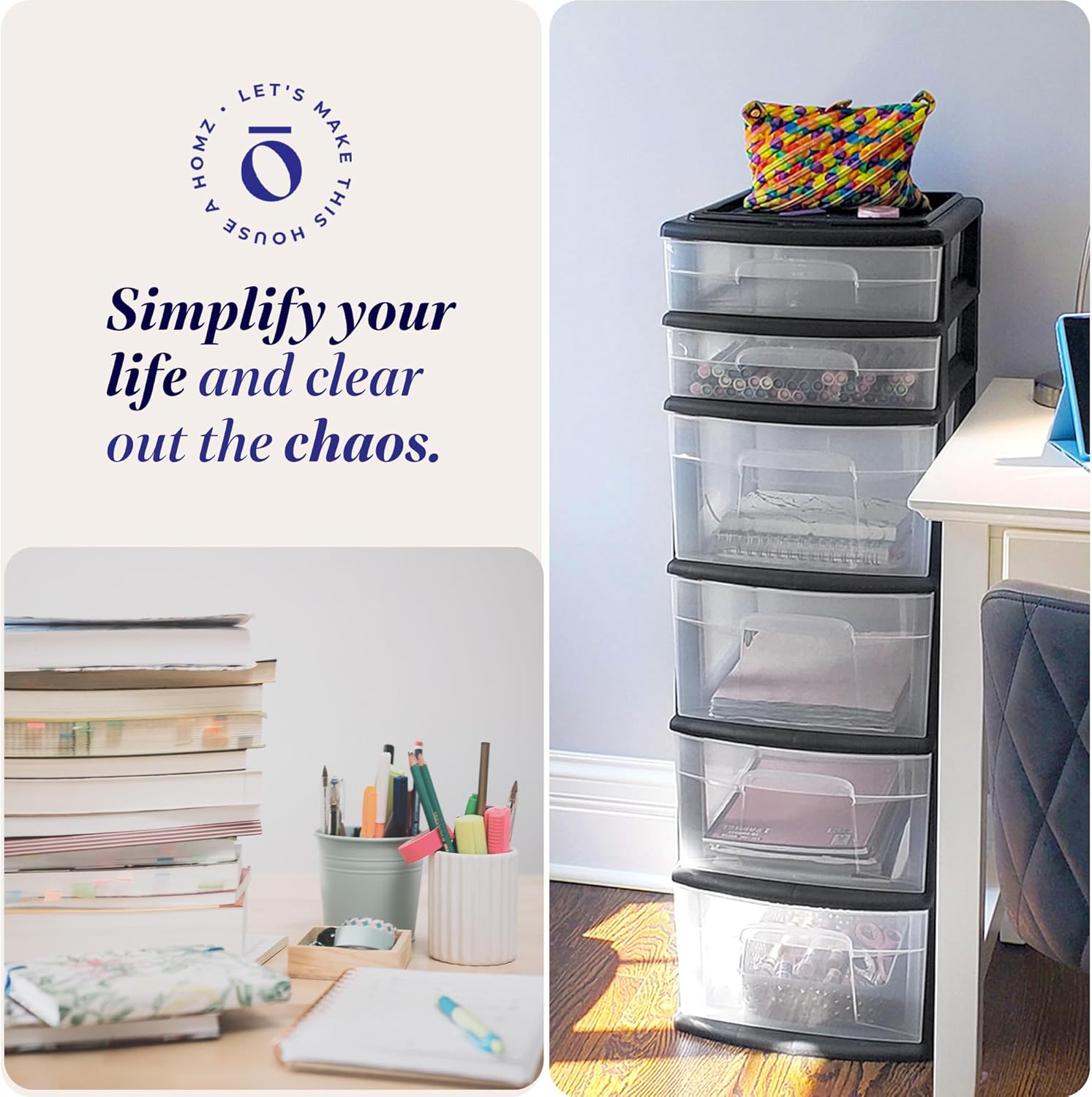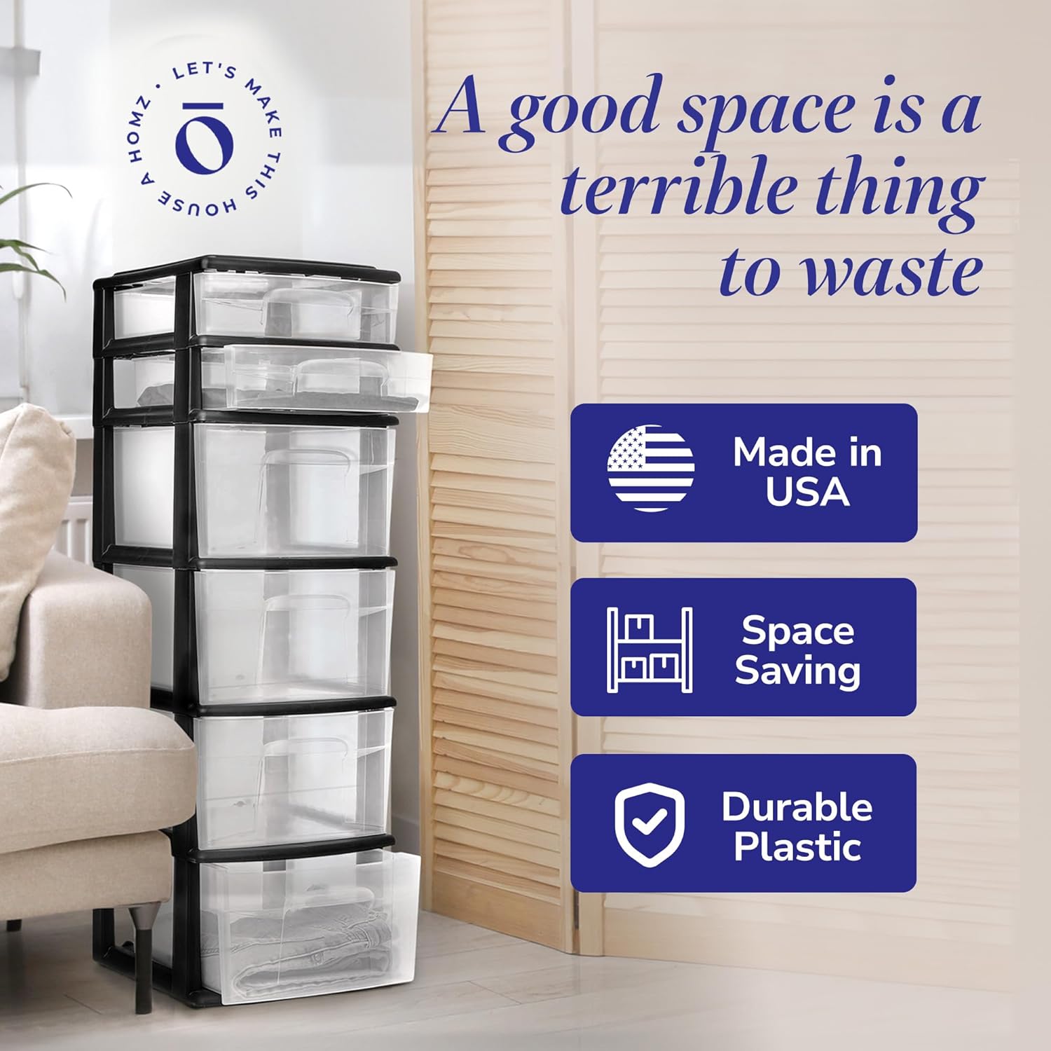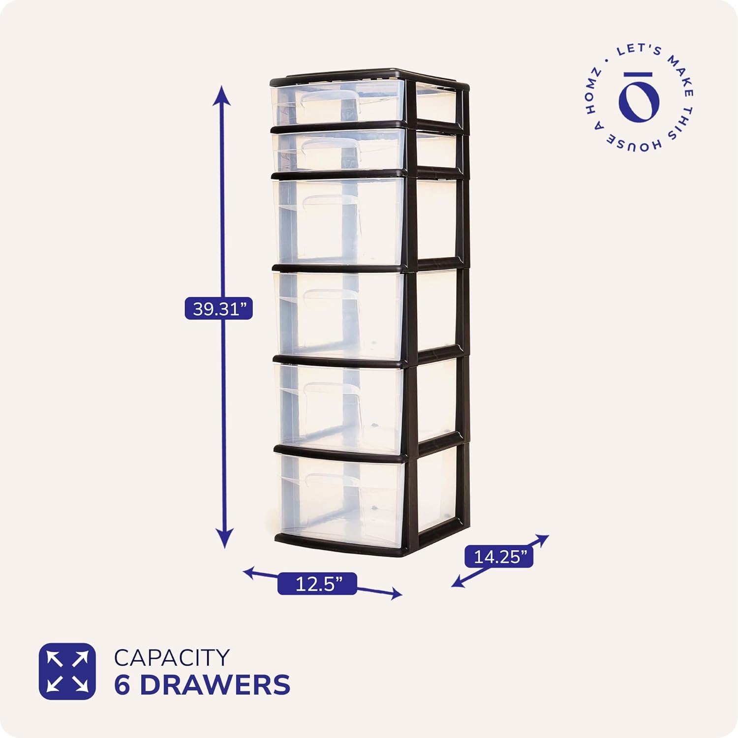 HOMZ Drawer Tower, 6-Tier Clear Plastic Storage Organizer Cart, Black Frame – Heavy-Duty Organizing Drawers for Home, Bedroom, and Closet Organization