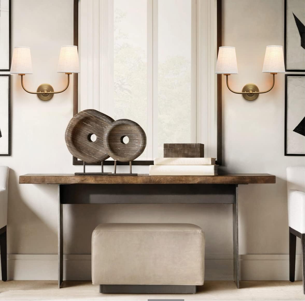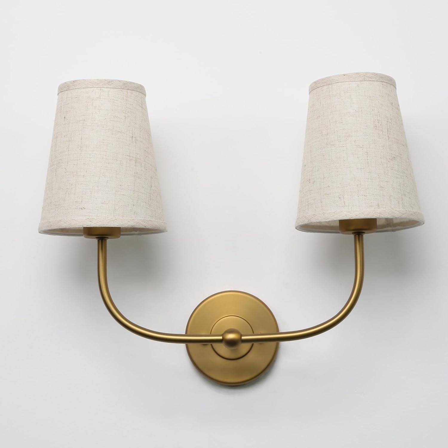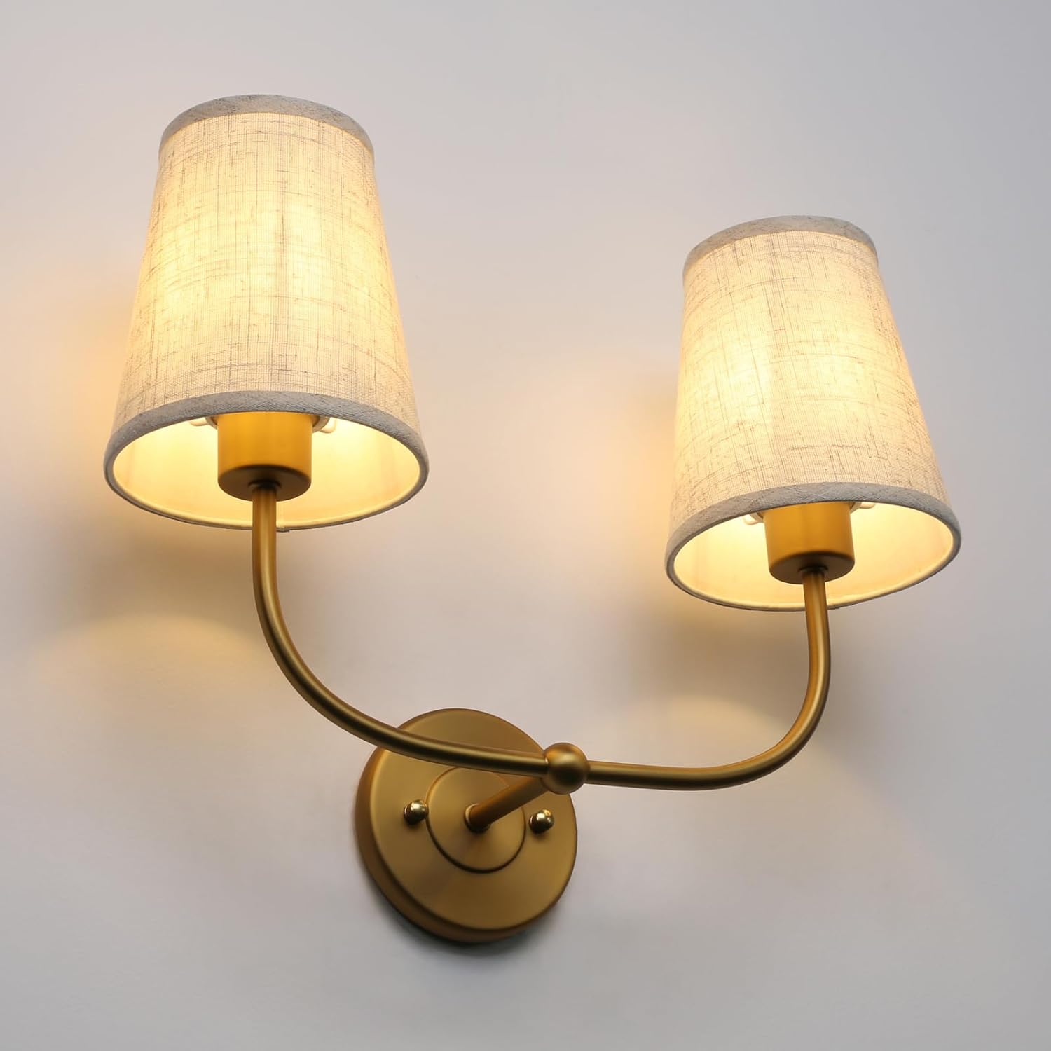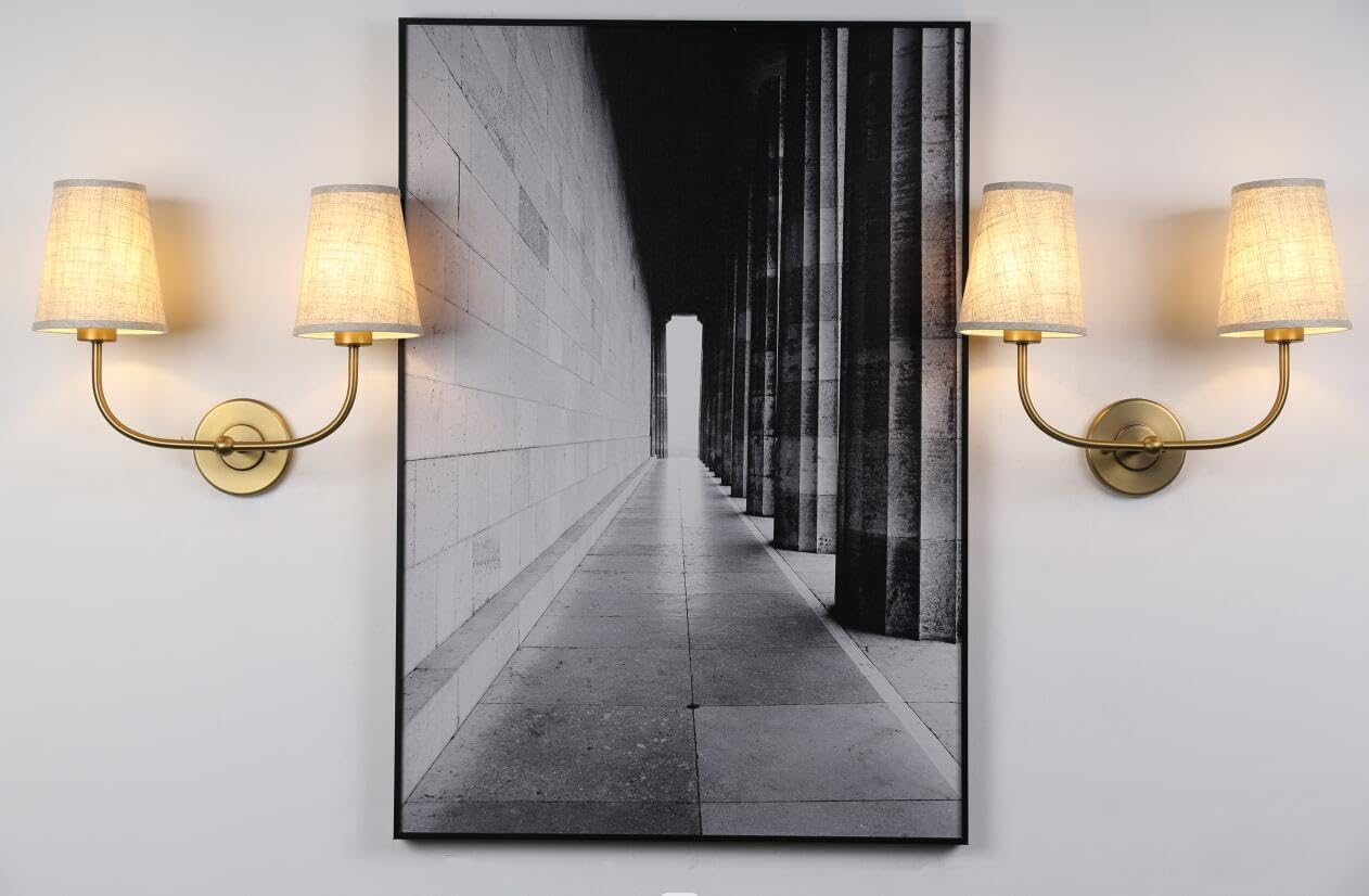 PERMO Vintage Double Sconce Large Antique 2-Lights Sconces with Flared Funnel Linen Beige Fabric Shade Hardwired Double Wall Sconce E26 Base