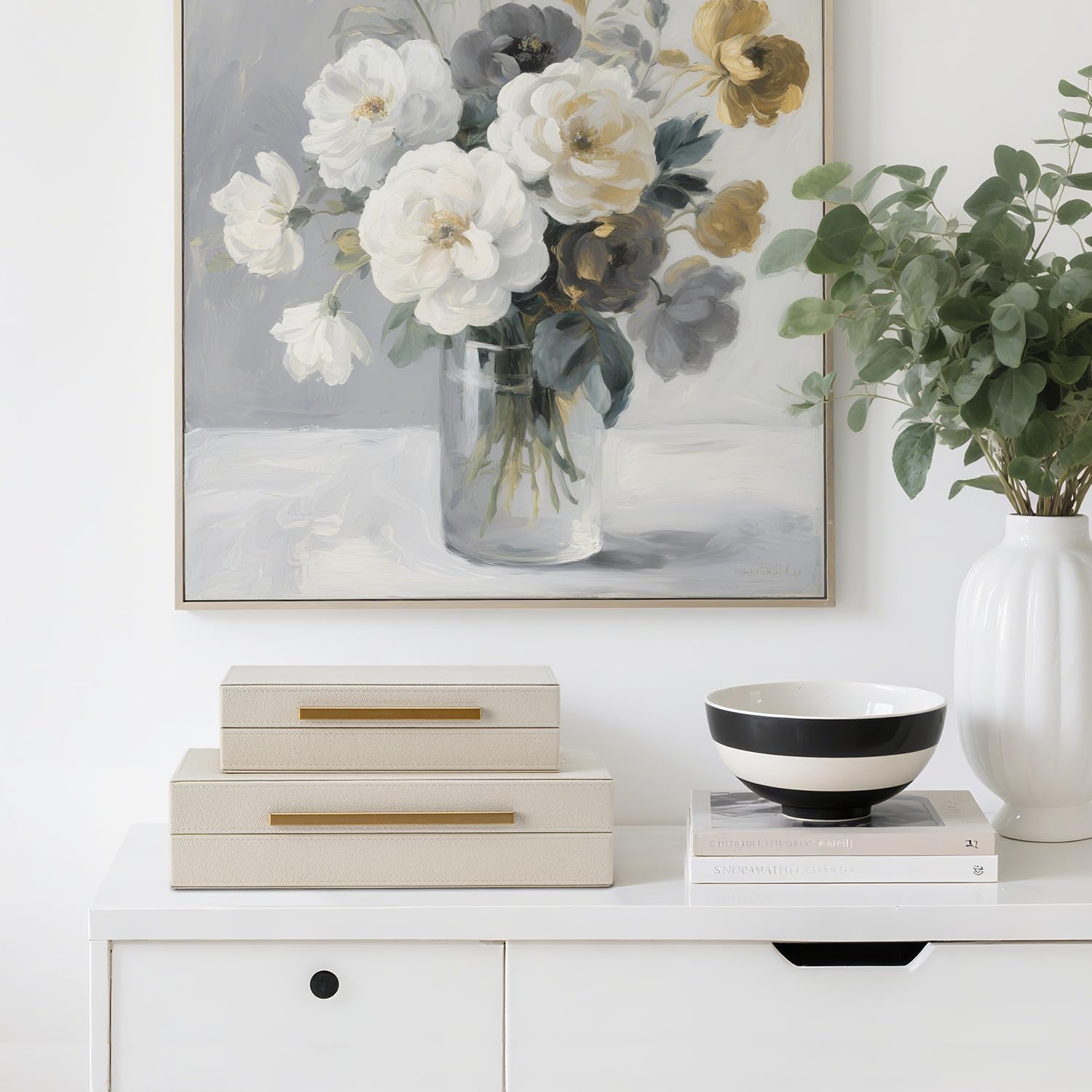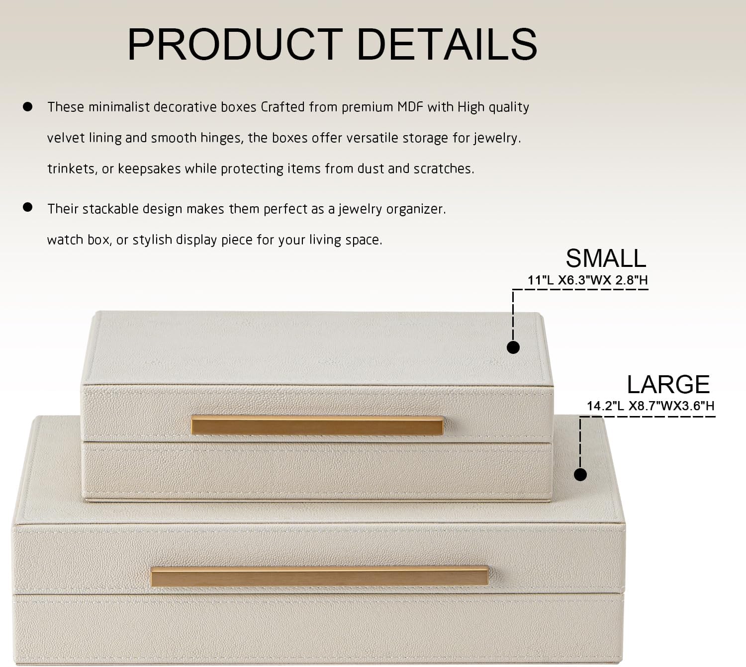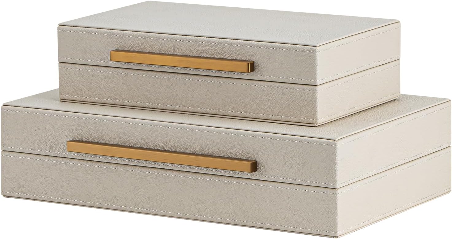 Set of 2 Beige Shagreen Decorative Storage Boxes with Gold Metal Handles – Faux Leather Jewelry & Memory Boxes, Nesting Photo Organizers for Home Decor