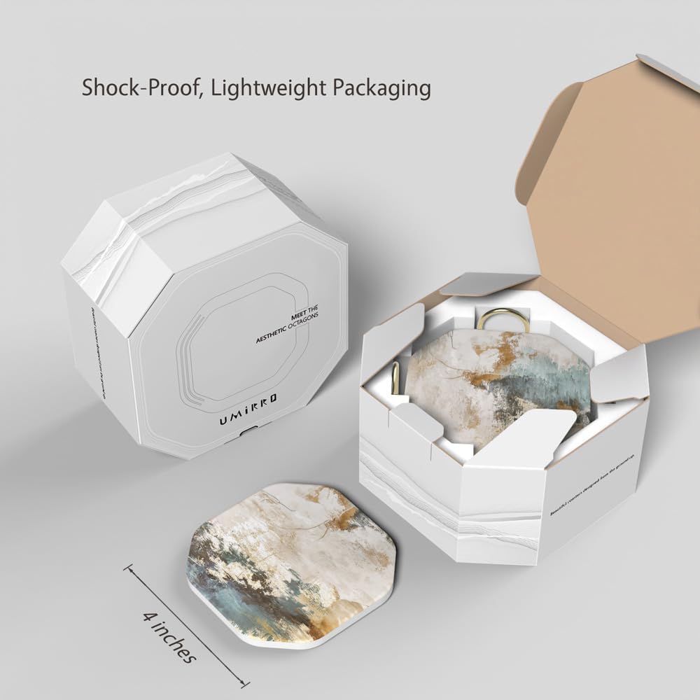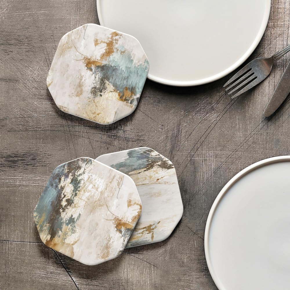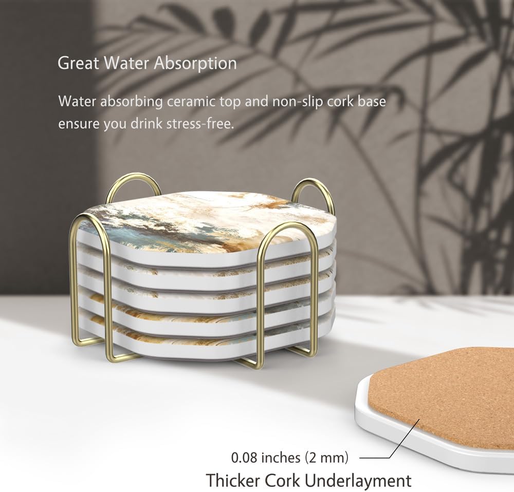 UMIRRO Ceramic Stone Coasters for Drinks Absorbent with Holder for Wooden Coffee Table Decor, Stoneware Cup Coasters for Iced Cold or Hot Drinks, Rustic Retro Boho Style, Gold, 4″ Set of 6