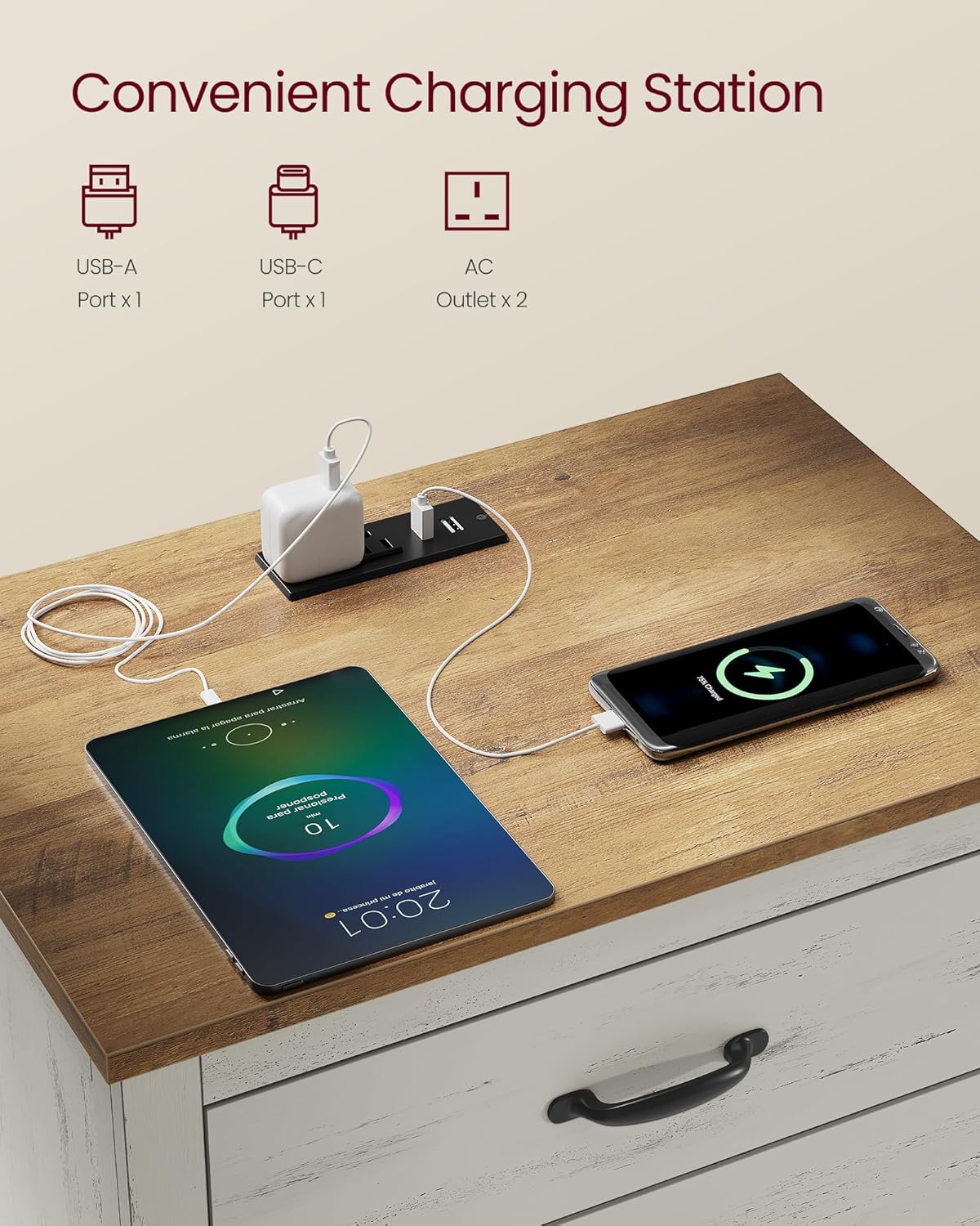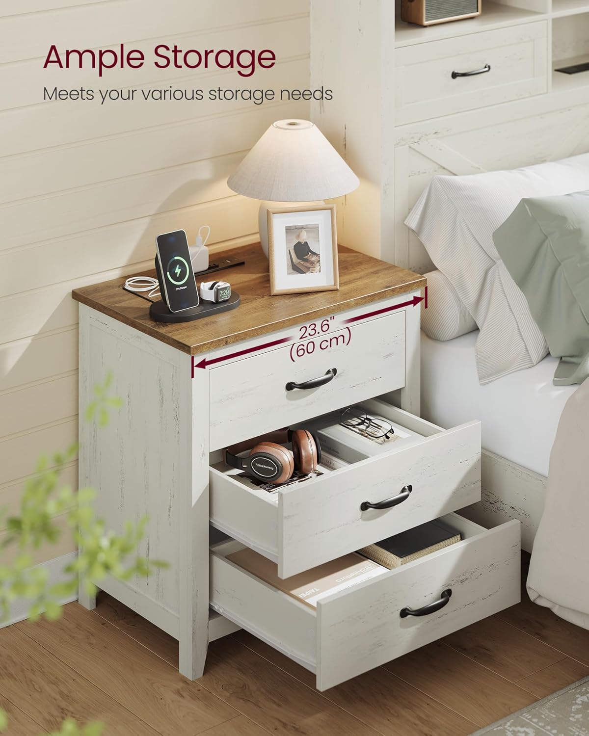VASAGLE LIRY Collection – Farmhouse Nightstand with Charging Station, Bedside Table, Side End Table with 3 Drawers, for Bedroom, Rustic White and Honey Brown ULET679W01