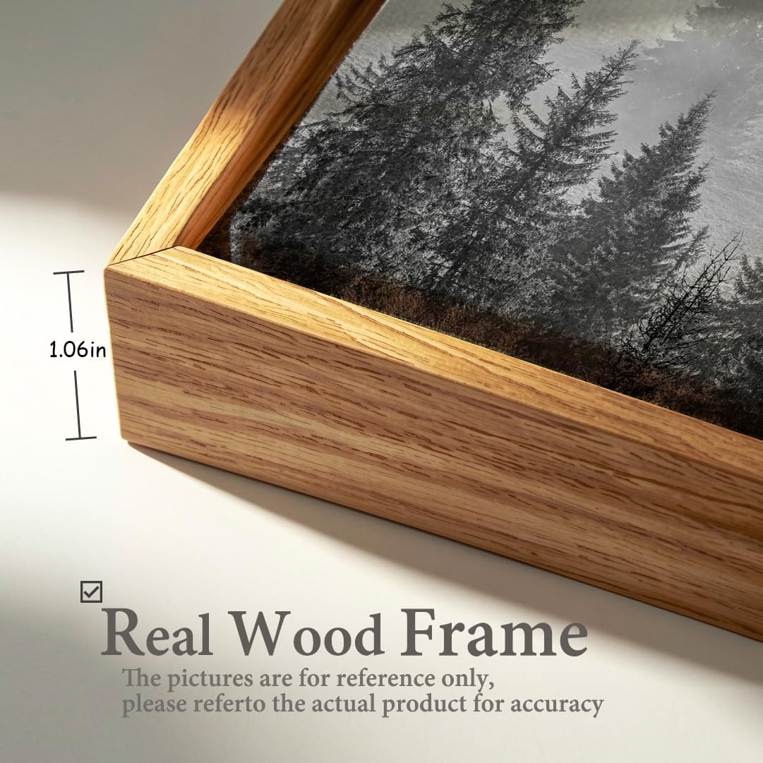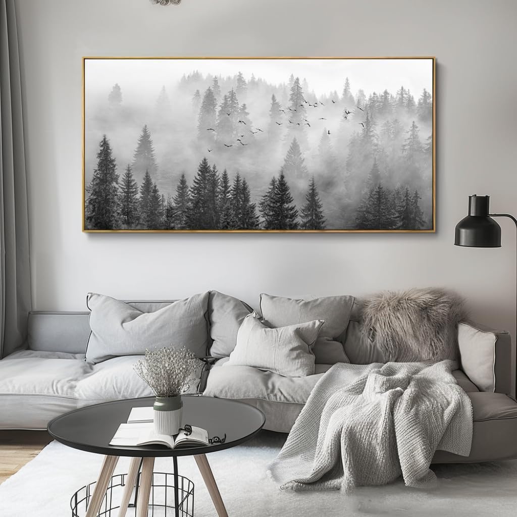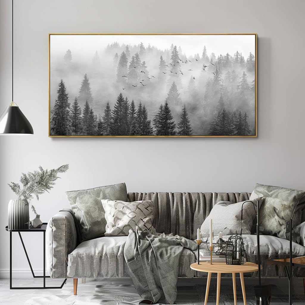 vgrozirh Framed Ready to Hang Wall Art Foggy Forest Black and White Wall Art Nature Landscape Mountain Photographic Printed on Canvas for Bedroom Living Room Office Home Decor 20″x40″