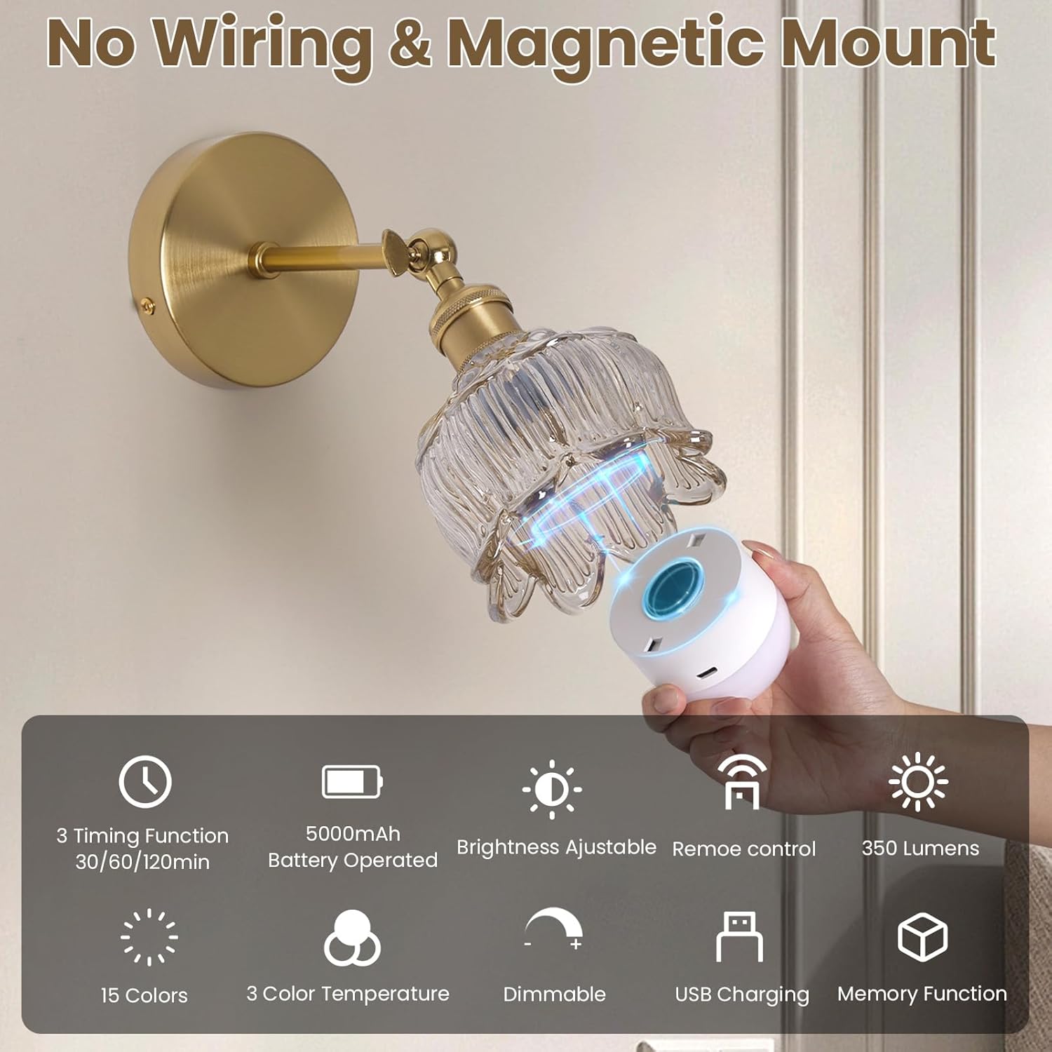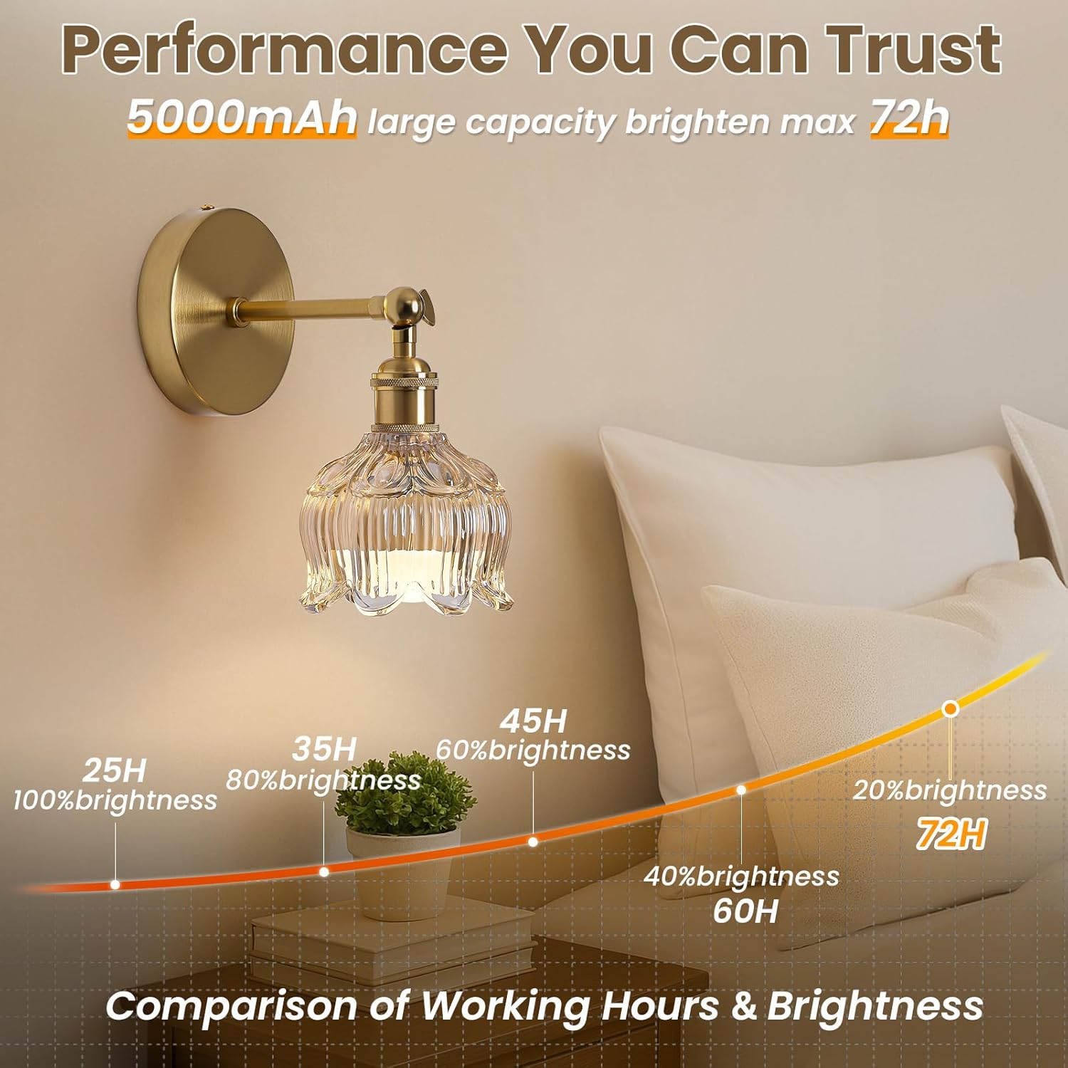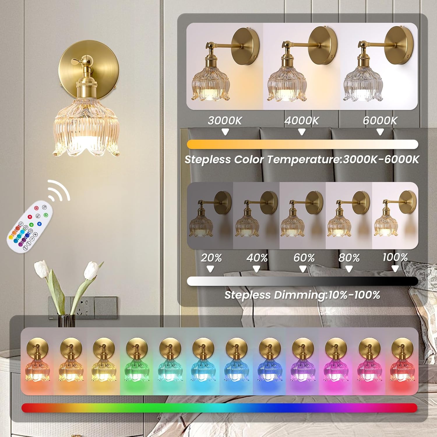 Vintage Battery Operated Wall Sconces – 5000mAh Rechargeable Dimmable Lights with Remote Control – Set of 2 Cognac Flower Glass Cordless Mounted Lighting – Wireless Powered Light Sconce for Bedroom
