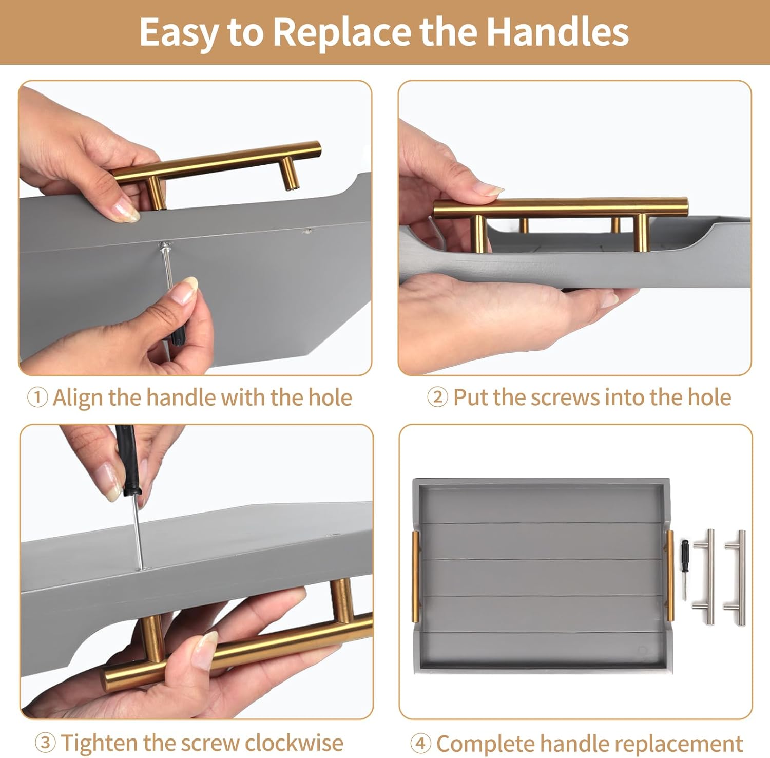 Wooden Serving Tray with 2 Sets of Handles,Large Ottoman Tray for Living Room, Rectangular Wood Tray for Coffee Table, Modern Farmhouse Kitchen Decor, 4 Round Coasters Included,Gray